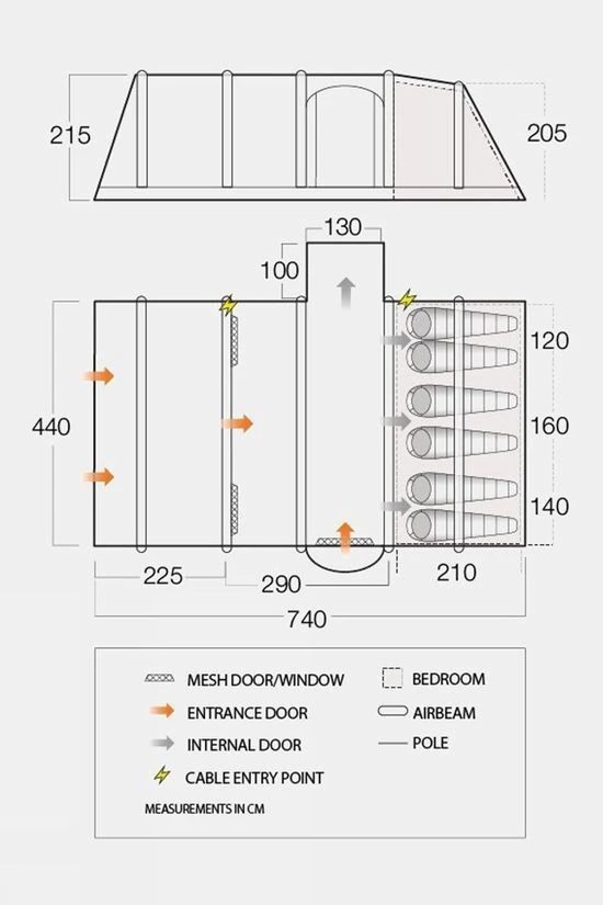 Flysheet: Waterproof Sentinel ECO Dura 3,000mm HHGroundsheet: Waterproof PEVilla ConstructionFamily Construction Bedroom with varying widths of 120/140/160 cm bedroomsFully Wind and Rain Tested – Weather tested to standard EN ISO 5912 Fire Retardant Fabrics – Exceeds European EN5912 safety standard King size bedrooms – Provides a 70cm sleeping area per person Double Action Pump with a pressure dial and handy carry bagToggled inner divider – Provides flexible sleeping optionsVango AirZone – High and low level ventilation panelsSmart Pack Bag – Full front of the bag drops downMidnight Bedrooms – Premium darkened fabricNew -AirBeam S.I Pro – Single point inflationMesh doors- Increase the flow of airZippered cable entry point with tidies SkyTrack II flexible hanging systemSide Pod – additional storage areaUPF30 ** UV protection factorFront & Rear storm anchorsTBS II Tension Band SystemAdjustable Pegging SystemPre-Attached front awningFully Sewn-in groundsheetToggled privacy curtainsEnvironmentally friendly Clear access bedroomsHigh visibility guylines Flat Front Living Area Drop down door stepBuilt-in front awningFully Taped SeamsPre-angled beamsPanoramic windowCovered side soorDouble living areaHigh cable entryDouble zip doorAirZone PanelInner Pockets Packsize : L82 x H47 x W52cmWeight: 34.85kg