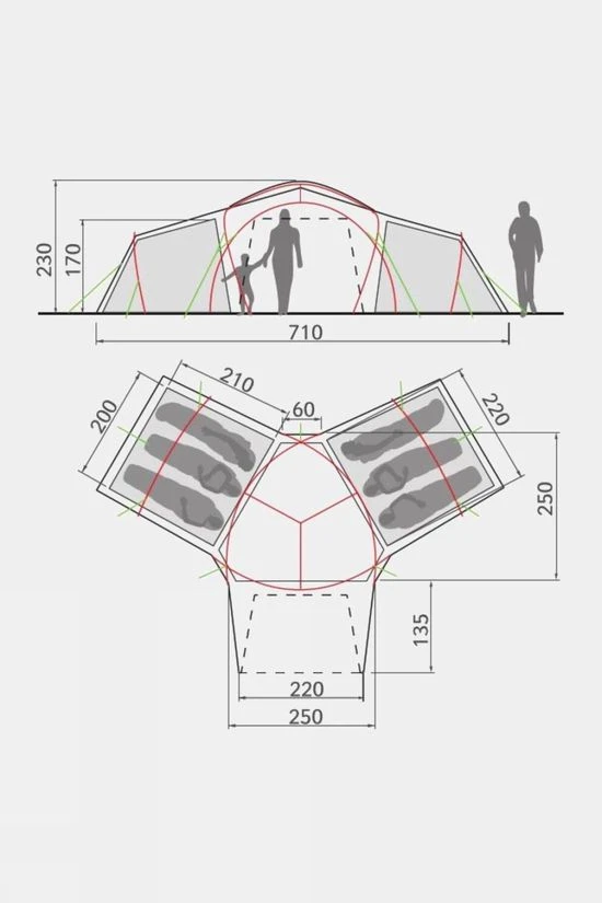 – Fully taped PU polyester outer – Breathable Polyamide inner – Organiser compartment – Additional guypoints for high winds – Alloy poles – Internal Dimensions Width:200cm / Length:210cm / Height:160cm for each of two sleeping compartments Weight 14.5kg